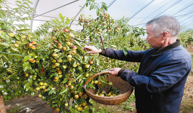10月20日,丹凤县铁峪铺镇化庙村群众在采摘冬枣。据悉,该村从2021年发展大棚冬枣,目前有6座大棚冬枣已进入产果期,预计今年可采收优质冬枣3000多公斤,带动村级集体经济收入6万元。(本报通讯员田东摄)