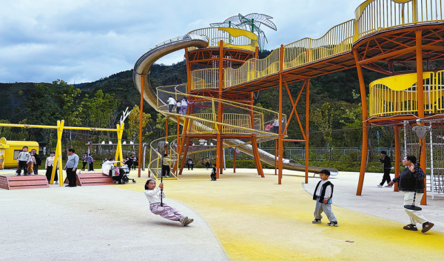 国庆假期后,丹凤县棣花镇葡萄星球游乐场延续“免门票”福利,作为丹凤本地特色文旅IP,此项举措激活本地游市场,成为家庭周末出行的热门选择。(本报记者 谢非 摄)。图为十月十九日,许多家长带着孩子在游乐场里玩耍。