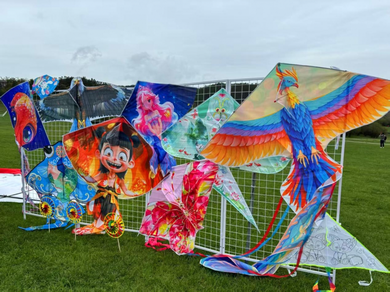 特色风筝集市:哪吒、孙悟空、小燕子等超多款童年梦幻风筝,深受游客喜爱,纷纷挑选心仪的风筝放飞。