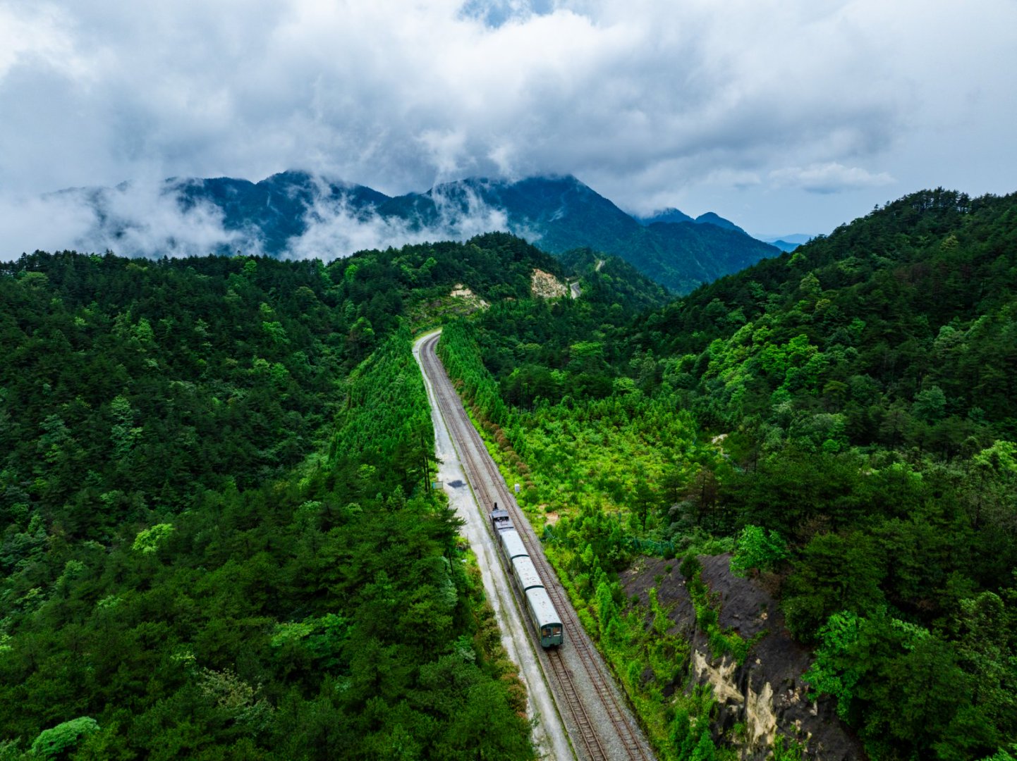 乘坐缆车登顶明月山后,艾芙琳漫步青云栈道,俯瞰月亮湖的碧波,并体验了高山小火车“嫦娥号”,沿途的云海、森林与村落交织,宛如画卷。 明月山小火车穿行在山野间。陈旅 摄