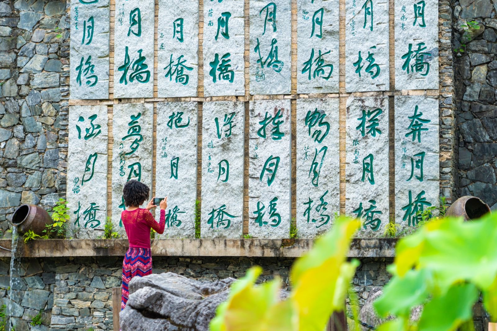 随后,艾芙琳探访了入选“国家森林养生重点建设基地”的二十四桥明月园。这座占地3150亩的综合性庄园以月亮文化和桥文化为主题,融合农业观光、森林康养、民俗体验于一体。园内自产自足的绿色食材、百亩花海、24座特色小桥,以及书法家创作的“明月”主题作品,令艾芙琳连连称赞:“这里实现了人与自然的完美共生。” 艾芙琳正在拍摄石刻书法作品 陈旅 摄