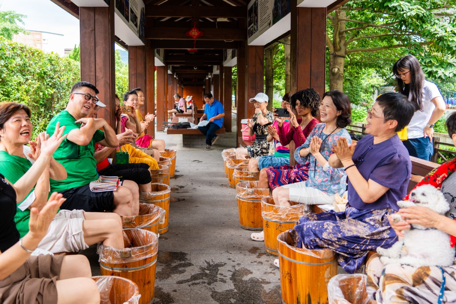 站在温汤古井旁,艾芙琳与来自上海、广州等地的“新温汤人”亲切交流。这群长期旅居的退休老人,每日在文化长廊泡脚、唱歌,享受富硒温泉带来的健康生活。来自上海的退休教师王美华已在温汤镇旅居3年。她说:“我患有轻度关节炎,来这里泡温泉半年后,疼痛明显缓解。现在每天和朋友们在长廊泡脚唱歌,生活惬意。” 艾芙琳与“新温汤人”在一起唱歌。陈旅 摄