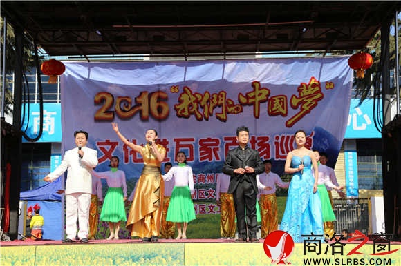 商洛之窗讯 (记者 方方 )2月15日,由中共商州区委宣传部、区文化广播影视局主办,区文工团承办的2016“我们的中国梦”文化进万家百场巡演在中心广场进行首次演出,演出包括小品、秦腔、配乐诗朗诵等精彩节目,此后将在商州区各个乡镇巡演二十场次。