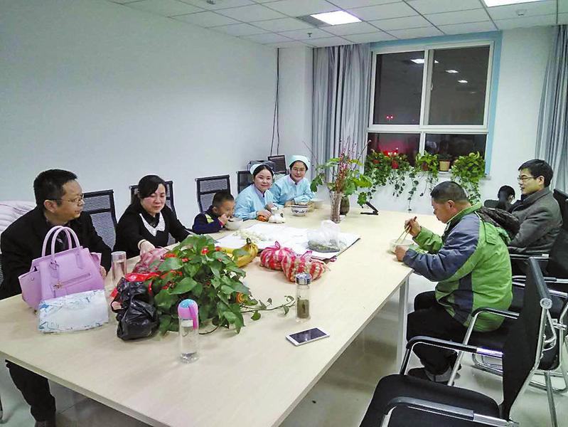 除夕夜晚上9点多,安静的医院走廊突然热闹起来。护士长曹春燕和科室主任王俊带着几个在家休假的护士提着饺子皮、饺子馅等食材出现在医院里。“大家过年好,我们来陪你过年了,祝您们早日康复!”说着话,大家一起走进了值班室。医护人员穿上围裙忙活起来,不少病人家属也加入了其中。9点40分,饺子出锅了,医护人员先给病房重病病人每人送去了一份,病人家属们也来到了值班室围坐着桌子一起吃起了团圆饺子。