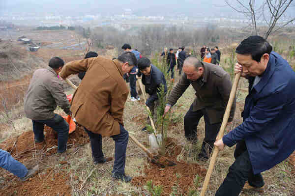 3月21日,市机关事务管理局干部职工50余人来到商州区杨峪河镇银明村,挥锹培土,义务植树2000余棵。 (王勇 摄)