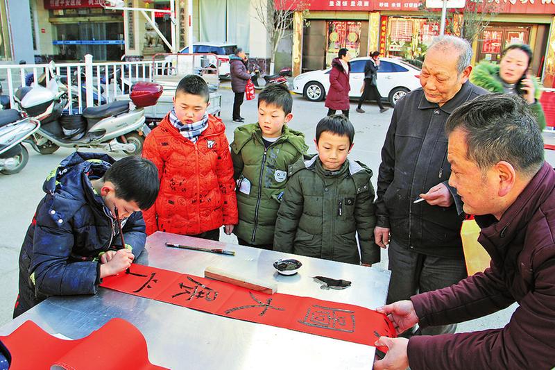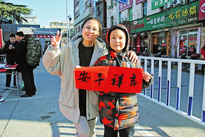在活动现场的一个角落,10岁的男孩刘子浩正在认真地书写着春联。“这娃字写得确实好,将来肯定有出息。”围观群众纷纷夸赞。就连一旁正在书写春联的老师也过来看,“嗯,不错,运笔好,基本功扎实”。一个十二三岁的女孩路过,看着写春联的男孩,对一旁的妈妈说:“妈妈,我也要学习书法。”刘子浩在城关二小读书,练习书法3年多时间,除过自学,在学校还参加了书法幸福课堂。“因为我爱好书法,所以一直在坚持,希望将我们中国的传统文化发扬光大。”刘子浩说。