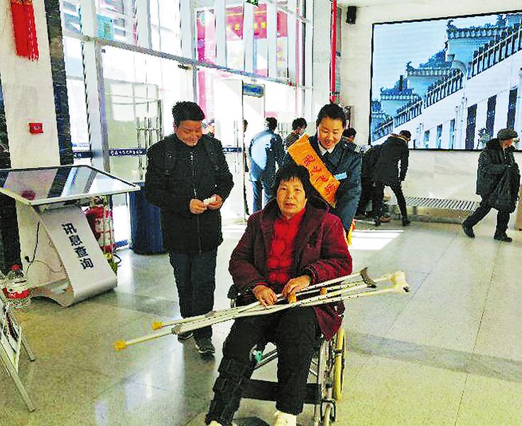 由客运站职工组成的“爱心飞扬服务班”的志愿者,热情地为乘客服务着。2月1日中午,志愿者在人群中看见一位大妈行动不方便,立即推来“爱心轮椅”,将大妈搀扶在轮椅上,并热情地帮大妈购买了车票。大妈感动地说:“像我们这样的残疾人最害怕出门,如果到处都有这样贴心周到的服务,那我们出门就容易得多了!”大妈对志愿者的帮助赞不绝口。