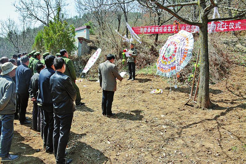 洛南县四皓街道马河村地处蟒岭腹地,在移民新村北边一处向阳的土山岗,当地人称“烈士台”的地方,这几天一下子热闹起来了。两座凸起的坟茔前摆放着花篮,近旁的乔木上悬挂着白花、纸绺,拄着拐杖白发苍苍的老人、戴着红领巾的少先队员、佩戴军功章的退伍军人,还有几对青年恋人,不约而同来到这里扫墓,面对墓地鞠躬。