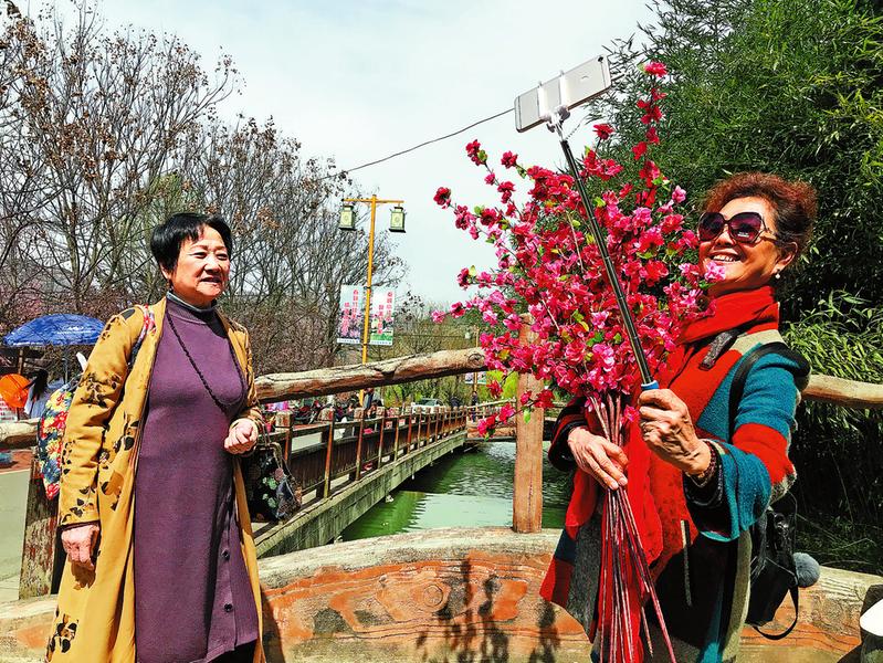 在丹凤县竹林关镇桃花仙子广场附近,电瓶车接送游客等服务为老年人上山观赏桃花带来便利。3月23日,68岁的王根引和女儿一起来到桃花谷,欣赏美景的同时购买纪念品、品尝特色美食也为旅途增添不少乐趣。