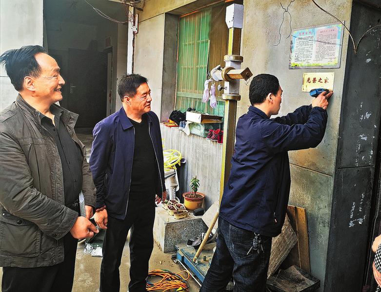 4月16日,商州区和平社区工作人员为退伍军人家庭上门安装“光荣之家”荣誉牌。据了解,和平社区登记在册的退伍军人家庭有273户,现在已经安装100多户。(记者 王孝竹 摄)