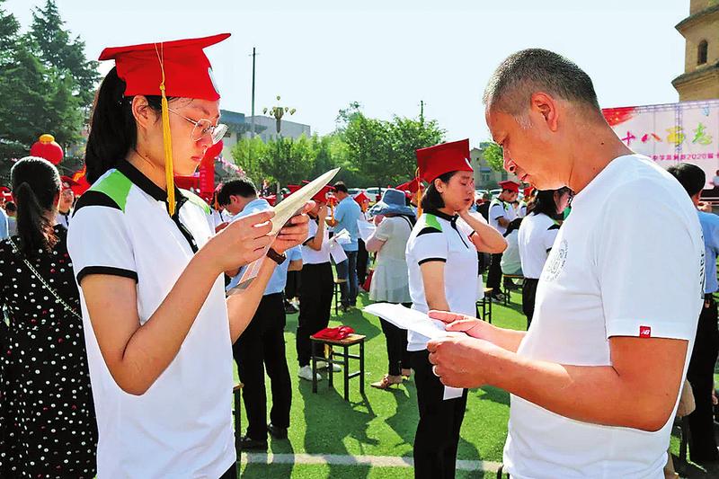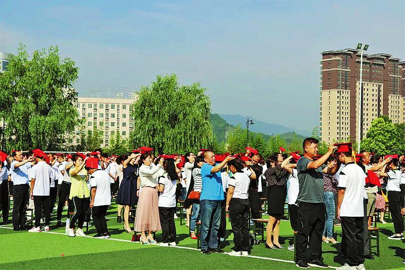 6月9日,商州区中学举行高2020级学生十八岁成人礼暨高三启航仪式。伴着老师和家长的美好祝福,学生们冠戴成人帽、走过成人门,怀着感恩之心、领悟责任担当,许下青春誓言、向人生梦想奋进。(党率航摄)