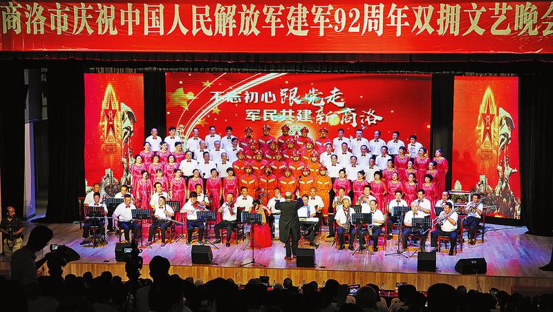不忘初心跟党走,军民共建新商洛。7月31日晚,由市双拥工作领导小组主办,市退役军人事务局、商洛军分区政治工作处承办的商洛市庆祝中国人民解放军建军92周年双拥文艺晚会在市行政中心举行。陈俊、郑光照、李豫琦、武文罡、牛克俭、于震、张晓明、杨长洲、李华、刘伟、夏启宗、刘向东等市上领导与驻商部队广大官兵、军队离退休老干部、部分退役军人代表等一起共庆建军佳节,畅叙军民鱼水深情。(记者李敏摄)