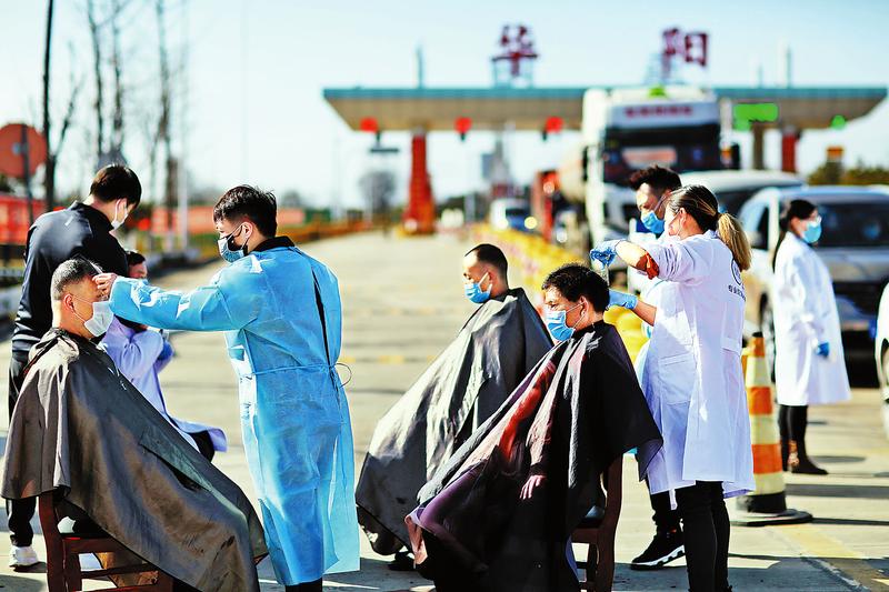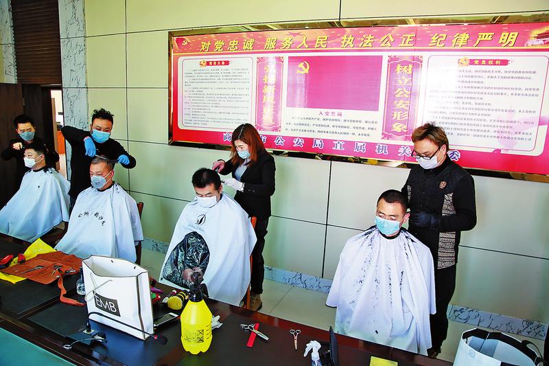 2月19日,市美容美发协会组织美发师来到市公安局,为参与防疫的公安干警提供免费理发服务。(张雯靓 摄)