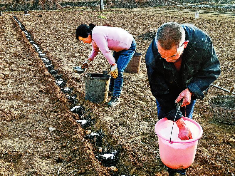 继续向西前行,在牧护关镇大商塬村四组远远看到一家人在田地中不停穿梭。近看,原来这家人在放下洋芋种的时,除了撒上碳酸氢铵肥料,老人还将自己配好的农家肥一同撒入。老人说:“今年买了一块五一斤陕北洋芋种,比去年贵了五毛钱。这一段时间雨水太少,为保洋芋出芽,我家用两种肥,还多浇了不少水,也不图卖多少钱就是自己种的给娃们吃放心。”