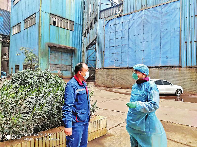 2月25日,白晶(右)在武钢某工厂对患者密切接触者进行追踪。