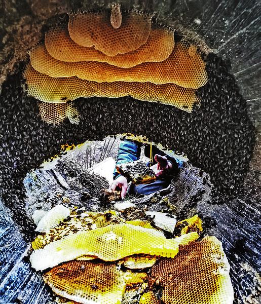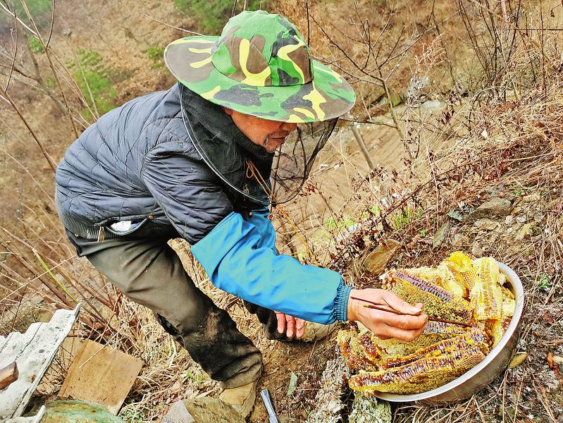 镇安县山大沟深,实施移民搬迁后,散落在沟沟壑壑的废旧村落成了野生蜜蜂的家园。在镇安县永乐街办午峪沟,笔者看见一位老人在山上收割野生蜂蜜和提纯蜂蜜的过程,用镜头记录下来。(晓阳 汪香珍 摄)