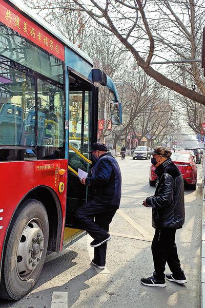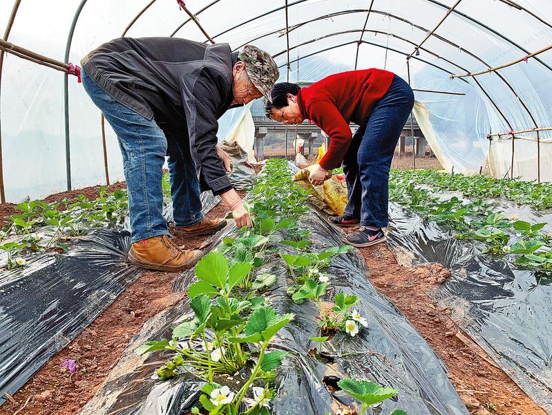 板桥镇郝晓权(左)在草莓田里除草▷市区公交车恢复运行