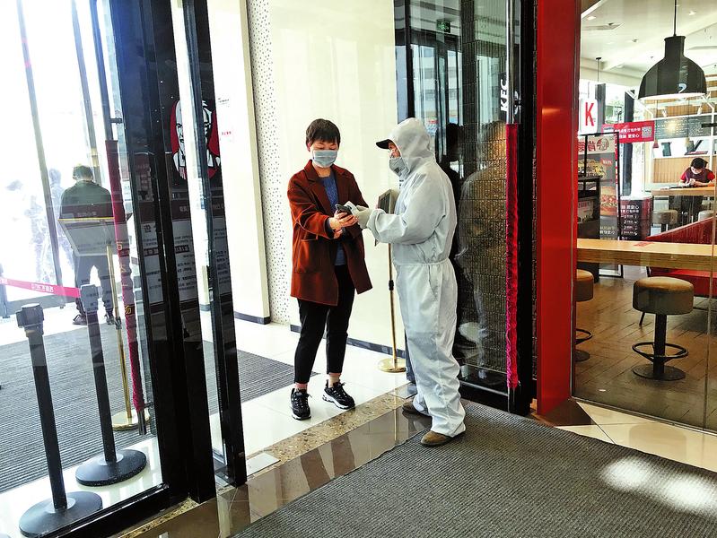 3月18日,某商场门口,工作人员通过体温检测和基本身份信息登记,严格筛查进出人员。