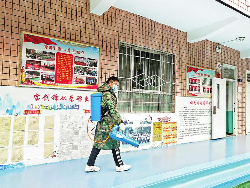4月3日,商洛市初级中学组织专人对教室、校园公共区域等进行打扫和消毒,为初三复学复课做好安全保障。(记者 王 倩 摄)
