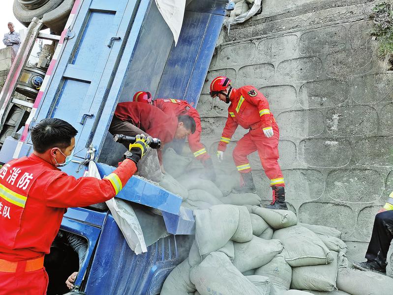 本报讯(杨鑫)4月7日,凌晨5时许,在商州区麻街镇王湾大桥附近发生一起货车侧翻事故,一辆拉满水泥的小型货车侧翻在路边的农田里,消防救援人员与交警联手成功救出车内被困的两人。