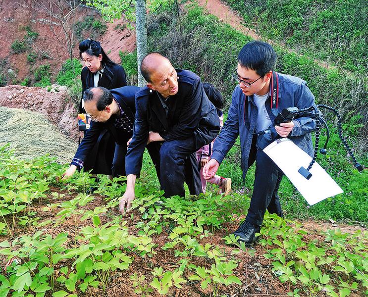 今年4月7日,王洋在商州区芦沟村中药材种植区,调研中药材病虫害发生情况。