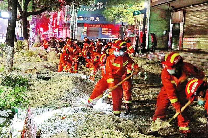救援现场气温骤降,冰雪水厚度达20厘米左右。不知不觉,消防指战员已在摄氏零下温度的冰水里浸泡了5个多小时。