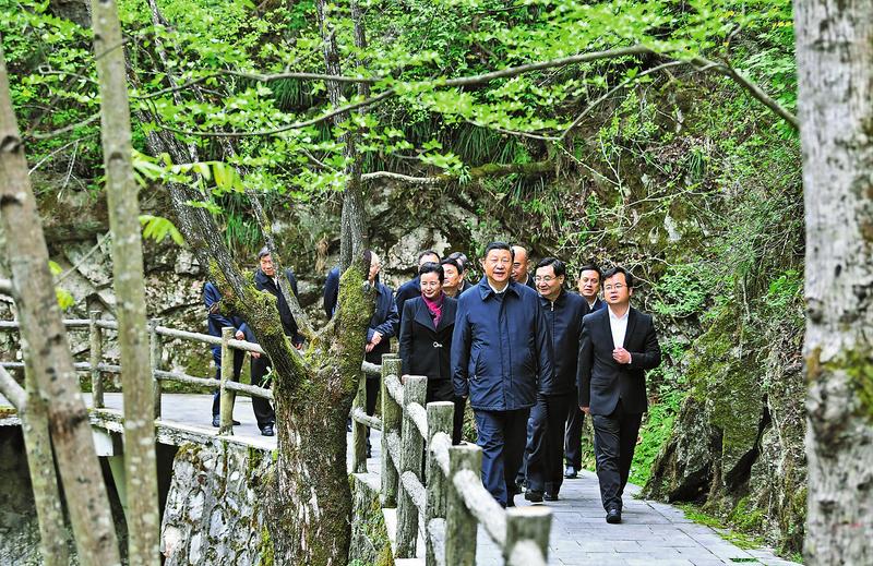 4月20日至23日,中共中央总书记、国家主席、中央军委主席习近平在陕西考察。这是4月20日,习近平在位于秦岭山脉东段的牛背梁国家级自然保护区羚牛谷,了解秦岭生态环境保护情况。(新华社记者 谢环驰 摄)