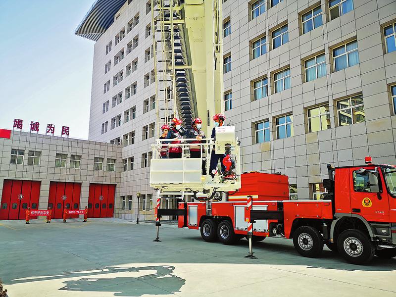 医务人员登上54米高的云梯消防车
