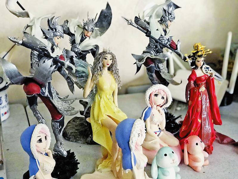 郑更民的作品具有鲜明的自己的艺术特色。他热爱挑战,喜好创新,每做一件作品之前,都会先构思,并且很看重创意。任何材质、造型、特点上的不同,只要是新的,他都可以吸收进自己的创意里来。工作室桌案上摆了一个巨大的网游人物面塑作品,插上电,还可以和游戏里一样闪闪发光。而这件作品,就是因为他无意中看到学生玩的网游里的人物形象之后,脑袋里碰撞出了创作的火花。
