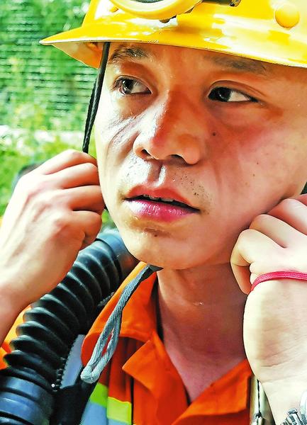 背负着 20 公斤的装备走完 1000米的矿洞, 队员汗流浃背 。