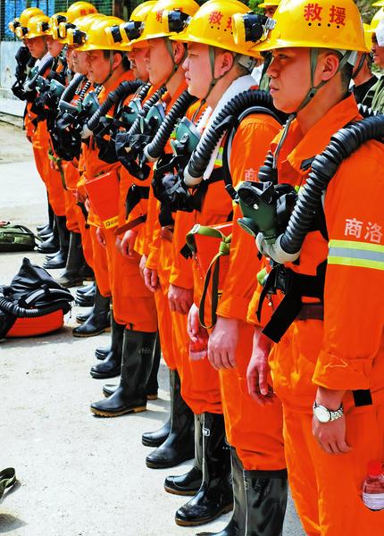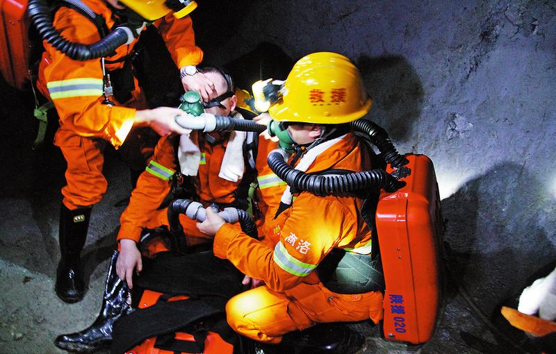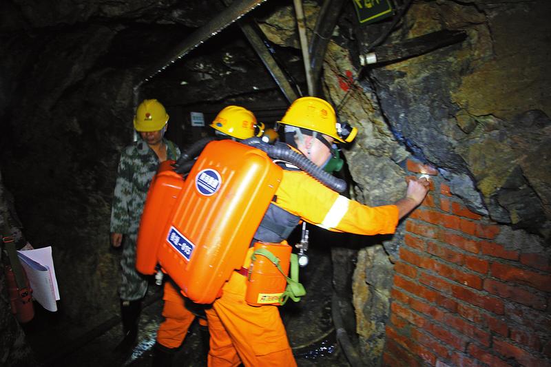 只见商洛市矿山救护队队员模拟接警后,迅速穿着重达20公斤的井下救援装备集合,指战员对下井队员逐个进行氧气呼吸器战前检查后,大家按照命令进入深40米、长1000米的矿井内部进行救护演练。