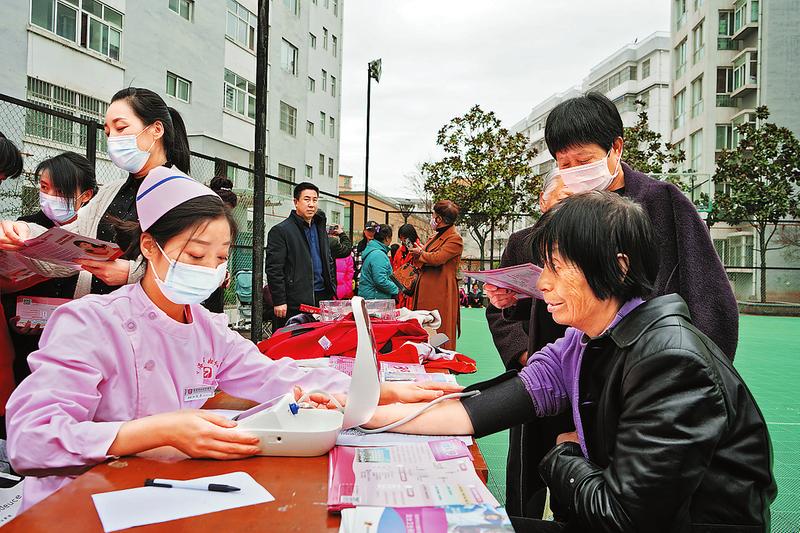3月5日,商洛市巾帼志愿者协会志愿者走进市区锌业小区开展学雷锋活动,为小区居民测量血压、理发、表演节目。(宋雨萌摄)