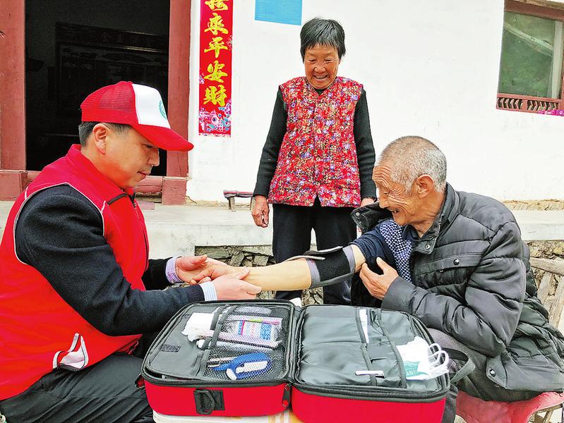 “血压还是有点高,降压药要按时吃,平时注意休息,吃饭要少盐低油,其他都好着,您放心吧!”4月15日,在山阳县高坝店镇鱼塘村,村医孙立军在对村民陈天喜进行随诊服务时,为其认真测量血压后,细心叮嘱他如何用药和注意事项。