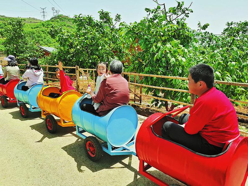 5月3日,丹凤县棣花景区以及核桃公园内游人如织。图为游客打卡核桃公园里的网红小火车。