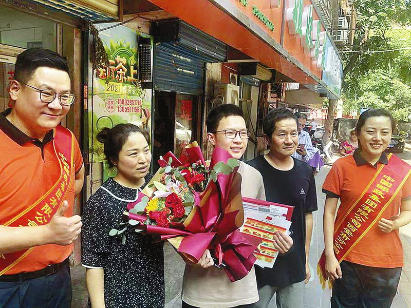 7月7日,闵政皓(中)和他的父母收到高考录取通知书时与邮政人员合影