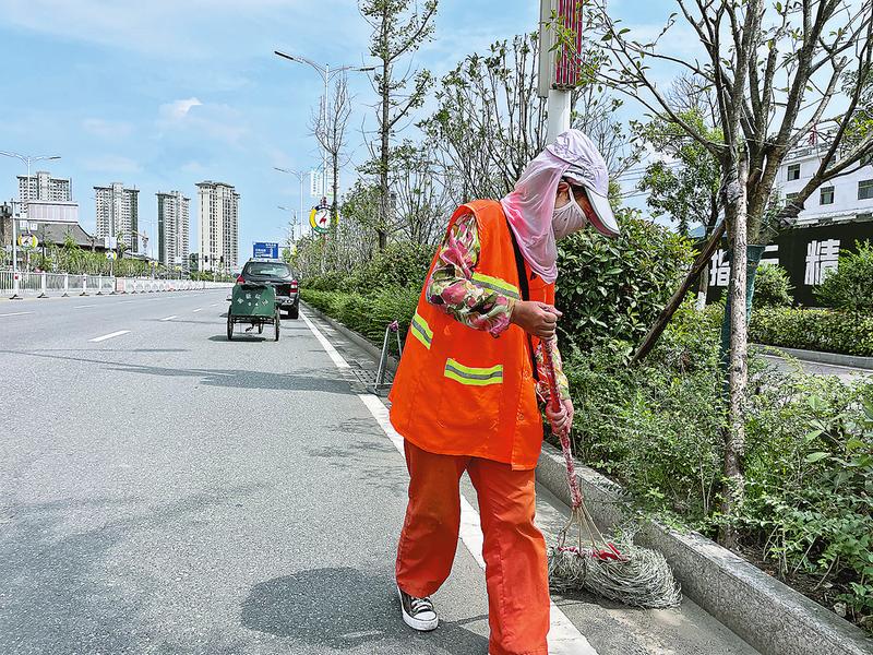 热了,环卫工人们拿出随身携带的毛巾擦一擦汗;渴了,喝一口随身携带的茶水。从清晨到中午,从下午到晚上,工作服一直是湿了干、干了又湿,正是他们的辛苦付出,换来了环境卫生的干净整洁。