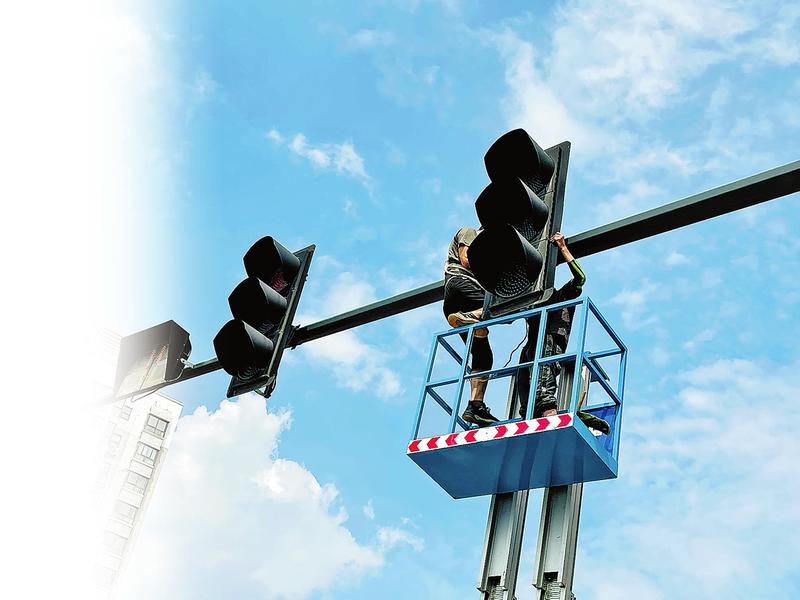 ②维修人员在高空抢修红绿灯