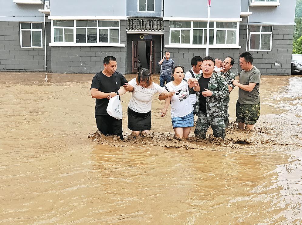 7月23 日,暴雨使洛南县灵口镇移民安置点被淹。当地党委、政府紧急组织灾民转移到安全地域。
