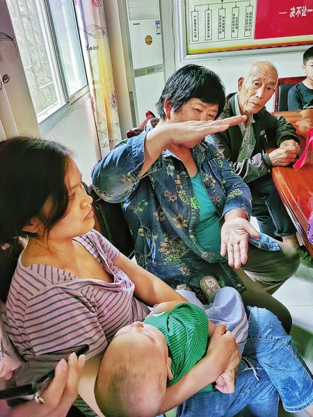 7月23 日,山阳县天竺山镇僧道关村临时安置点内,曹家坪组村民比画着家里的水有多深。