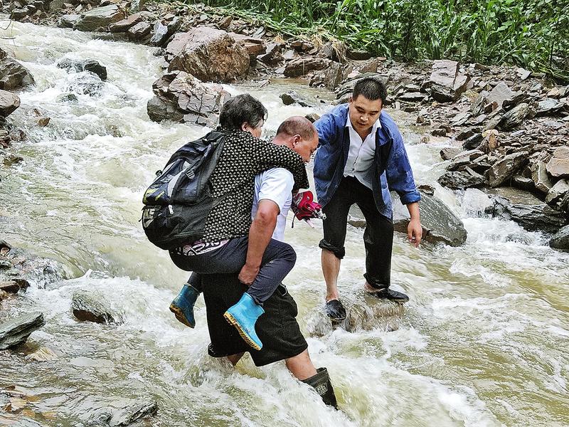 7月23 日,山阳县高坝店镇高坝街社区工作人员正在转移受灾群众。