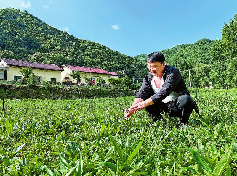 中伏天,烈日当头,酷热难耐。驱车进入柞水县曹坪镇,漫山碧绿如翠,平坦宽阔的水泥路在山脚下蜿蜒,路旁的民居错落有致,一副静谧美好的乡村美景图在眼前徐徐展开。车子驶入九间房村时,在一片绿油油的中药材基地里,九间房村党支部书记吕道杰正在查看地里的药材苗子。