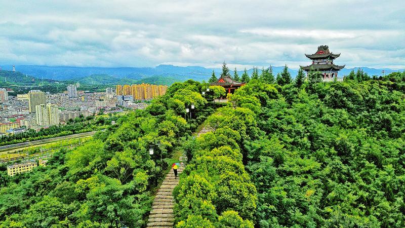 龟山公园东起贺咀村,西至双乳山,南北临山体自然坡脚,规划总面积45公顷。其中人工栽植绿化面积20900平方米,天然林42万平方米,其中栽植具有地方特色的乡土适生乔木树种40多种,2万多株。公园在绿化养护过程中将落叶和枯枝等有机质覆盖保育在树冠下,有效地保护了山体水土流失。2008年以来公园先后进行了三次提升建设,已经成为名副其实的城区中央森林氧吧和供游人休闲运动的城市森林公园。图为8月17日,记者航拍的龟山公园一角。(记者 杨鑫 摄)
