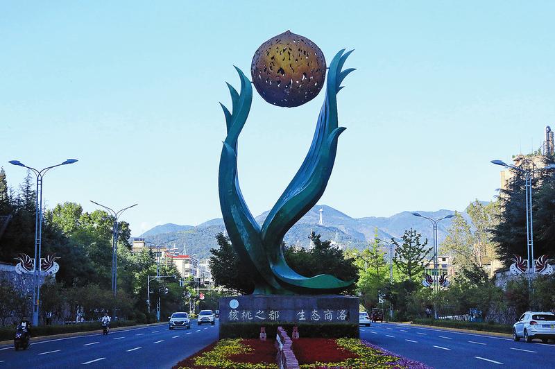 商洛核桃雕塑位于商洛市南大门迎宾大道。商洛核桃以其果大、皮薄、仁饱、口味油香享誉全国。1958年,毛泽东主席作出“陕西商洛专区每户种一升核桃,这个经验值得各地研究”的指示后,商洛历届党委政府高度重视核桃生产,建成了全国重要的核桃产业基地。近年来,市委、市政府坚持把核桃产业作为脱贫攻坚的主导产业,作为农民脱贫致富的重要途径,作为推动农村经济结构调整的重要抓手,着力促进产业转型升级、提质增效。2019年,核桃树被确定为商洛市市树,成为城市地域景观和人文特色的象征,是生动鲜活、彰显城市魅力的名片。