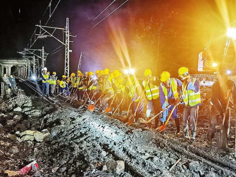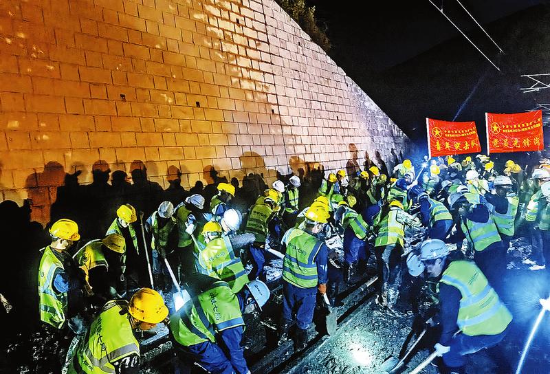 救急如救火。面对滑塌下来的270多立方米泥土和石块,抢险人员和铁路工务部门决定采用人工配合挖掘机的方式清理坍塌土石方。他们一边用铁镐与铁锹奋力清理钢轨及隧道顶上的土石,一边安排专职安全员对现场滑塌山体进行观察防护。经过7个多小时的艰苦奋战,于当晚11时,塌方清运完成,险情排除,抢险任务圆满完成并顺利通车。共计参与抢险人员150多名,投入挖掘机3台、吊车2台、装载机1台。