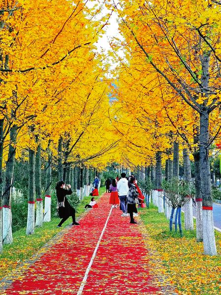 近日,市区滨江银杏公园银杏树叶灿若黄金,迎来了最佳观赏期,一阵秋风吹过,银杏树叶纷纷扬扬地从树上飘落下来,宛如无数只金色的蝴蝶在空中漫天飞舞,美不胜收,吸引众多市民前来拍照打卡。(李岩摄)