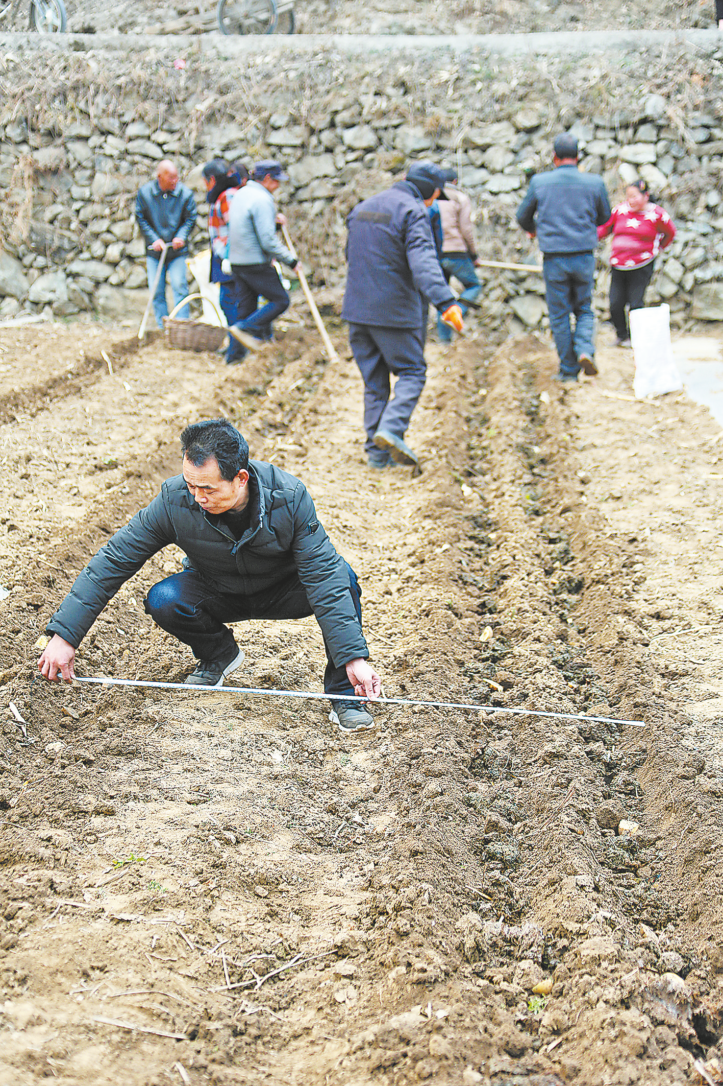 商州区农技中心工作人员测量地膜洋芋种植行距,指导群众规范种植。