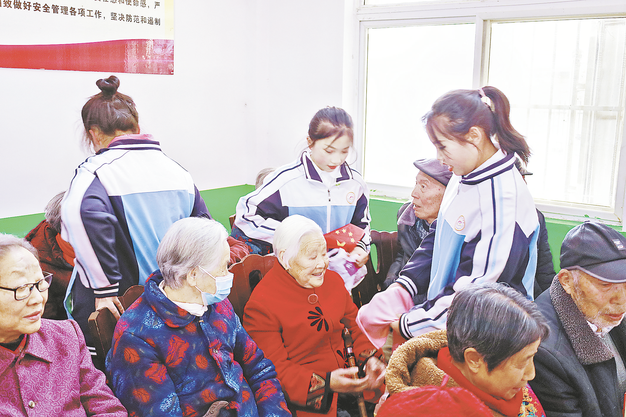 △3月2日下午,丹凤县初级中学200多名师生赴丹凤县老年公寓开展“不忘初心学雷锋 牢记使命我践行”主题志愿服务活动。同学们带来内容丰富的文艺表演,通过给老人赠送小礼物、搀扶老人散步、打扫卫生、整理房间等,增强了他们敬老爱老、服务社会意识,践行了雷锋精神。 (记者 谢 非 摄)