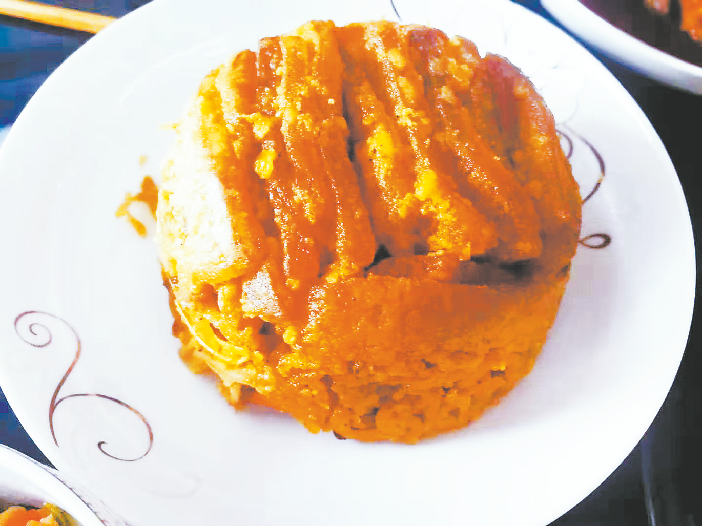 酒席正酣时,厨师将装粉蒸肉的碗扣在盘子里,揭开碗,一盘金黄闪亮的玉米粉蒸肉出锅了。压轴大菜玉米粉蒸肉上桌,客人们迫不及待地说:“吃吧,趁热吃吧。”夹起一块肉,玉米面裹着肉片,有红有白,晶莹剔透,一口咬下半边,软糯而清香,甜酥而爽口,真乃人间至真美味。平日不吃肥肉的女子也禁不住诱惑,免不了夹起一块粉蒸肉吃下去,最妙的是盘底裹着玉米面的蒸粉条,筷子夹着还在不停地打颤战,与蒸肉的美味相得益彰,吃上一口,香甜无比。