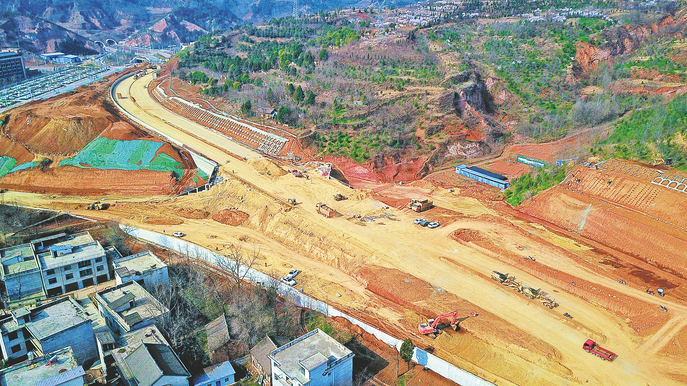 市环城西路建设项目南起203省道,北至构峪口,沿线跨南秦河、穿龟山、经蟒龙峪,设计双向6车道,总长4050 千米。一期工程203省道至马莲峪路立交段, 已于2019年9月26日正式建成通车,二期工程马莲峪路立交至构峪口段,目前正在施工。项目建成后,将主城区和南秦新区连为一体,使城市南北交通更加便捷。图为3月14日记者航拍的环城西路项目建设现场。 (记者 杨 鑫 摄)