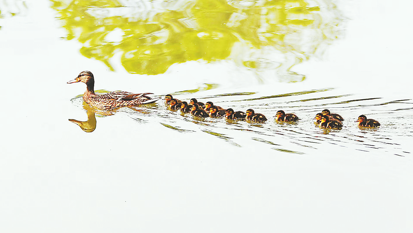 近年来,商洛生态环境持续优化,人与自然和谐相处,引来野生动物栖居丹江沿岸湿地自然保护区,市区莲湖公园内长期栖息着野鸭与人工放养的白鹅、鸭子。4月19日,莲湖公园内几十只野鸭成群结队在湖面游走、嬉戏,引来众多市民欣赏、拍摄。 (本报记者 王孝竹 摄)